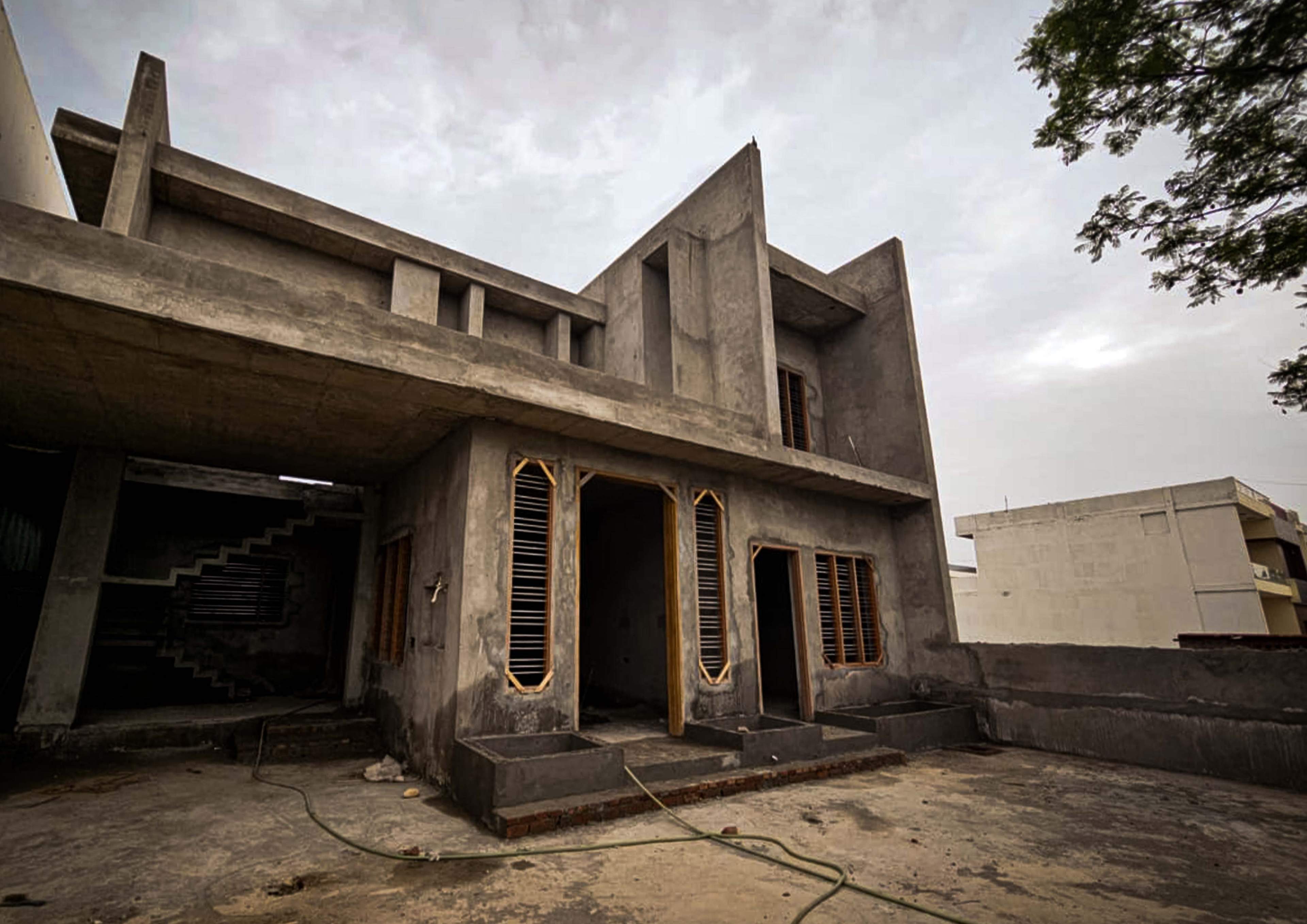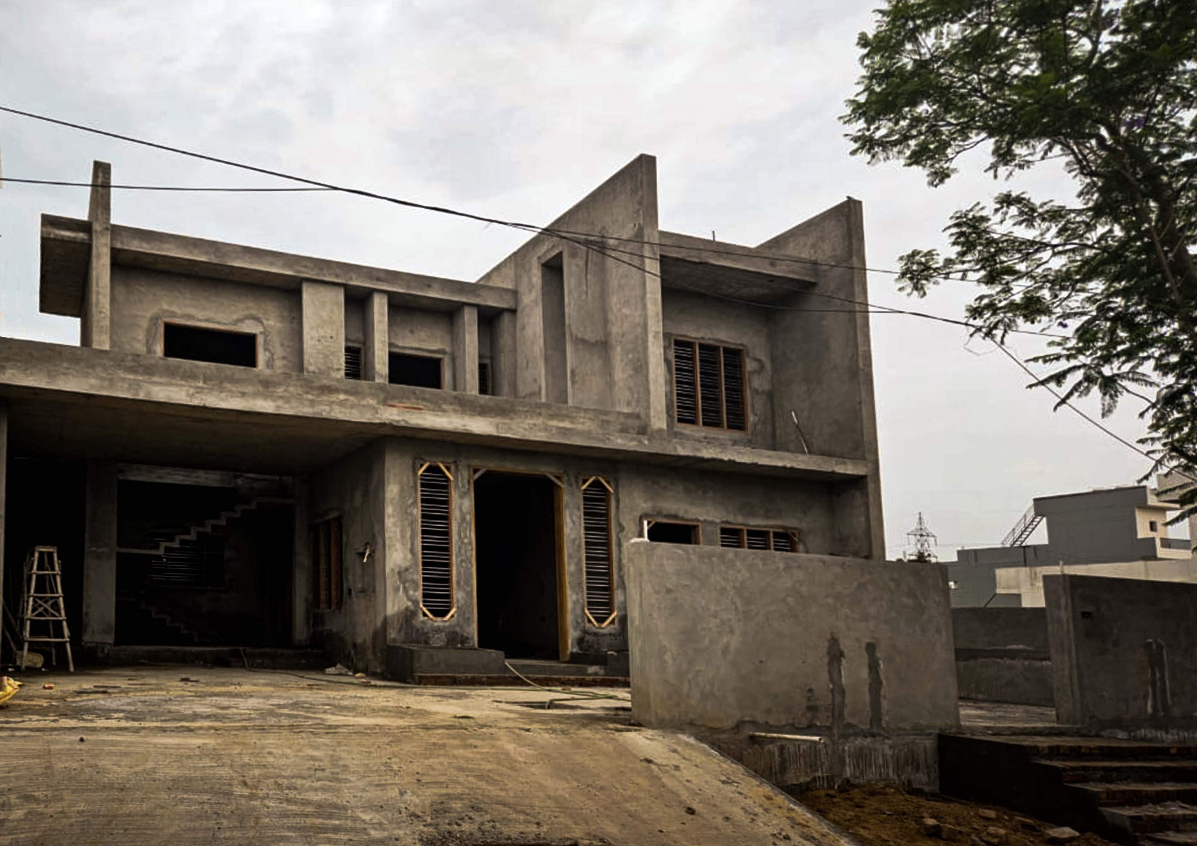 A key architectural feature is the handcrafted metal Jaali screen, which adds depth, texture, and dynamic shadow play while maintaining privacy and ventilation. The villa’s extended walls, contemporary massing, and carefully curated material palette establish a bold, modern identity, making it a standout structure in the neighborhood. As the project progresses through its construction phases, it continues to evolve, ensuring a harmonious fusion of vision, craftsmanship, and architectural excellence.